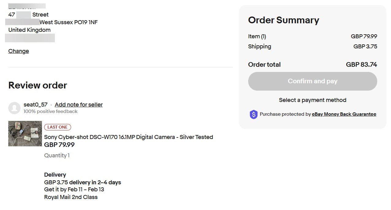 At checkout, using an address in West Sussex shows £3.75 for postage for a fee inclusive total of £87.01.