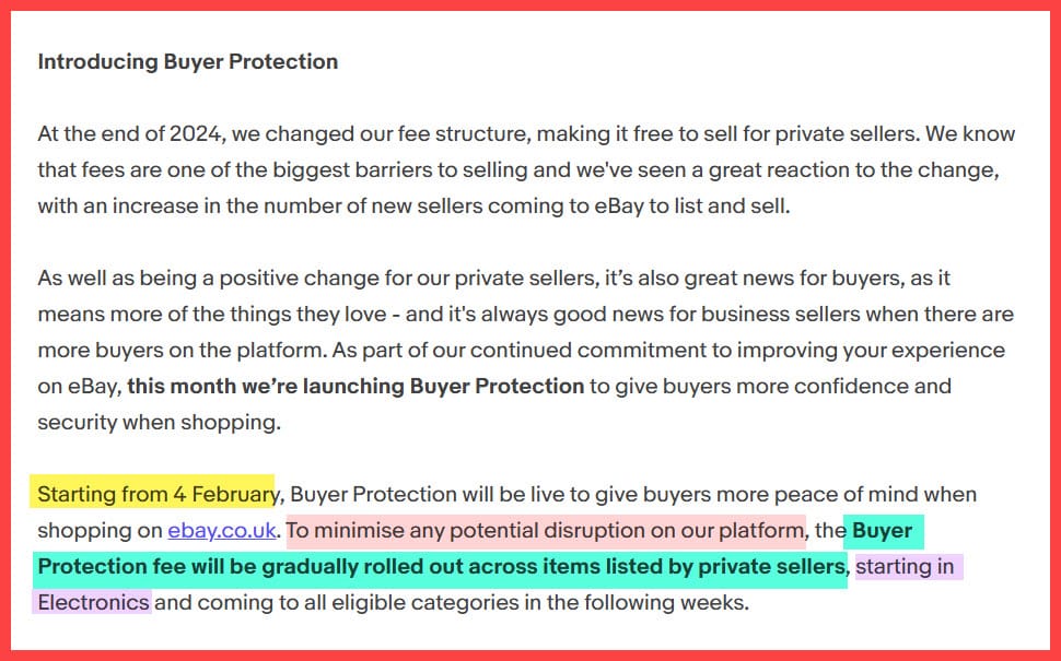 The news was tucked into a broader announcement about changes launching in February posted in the eBay UK community, informing users the new Buyer Protection Fee will initially be starting only with listings in Electronics on February 4th and then expanding to other categories "in the following weeks".