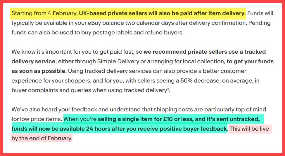 The same UK community post also revealed changes to the new policy about when private sellers will get paid, making a small concession for lower value items allowing payments to be released 24 hours after a buyer leaves feedback for untracked items, instead of having to wait the full 14 days from the order date.