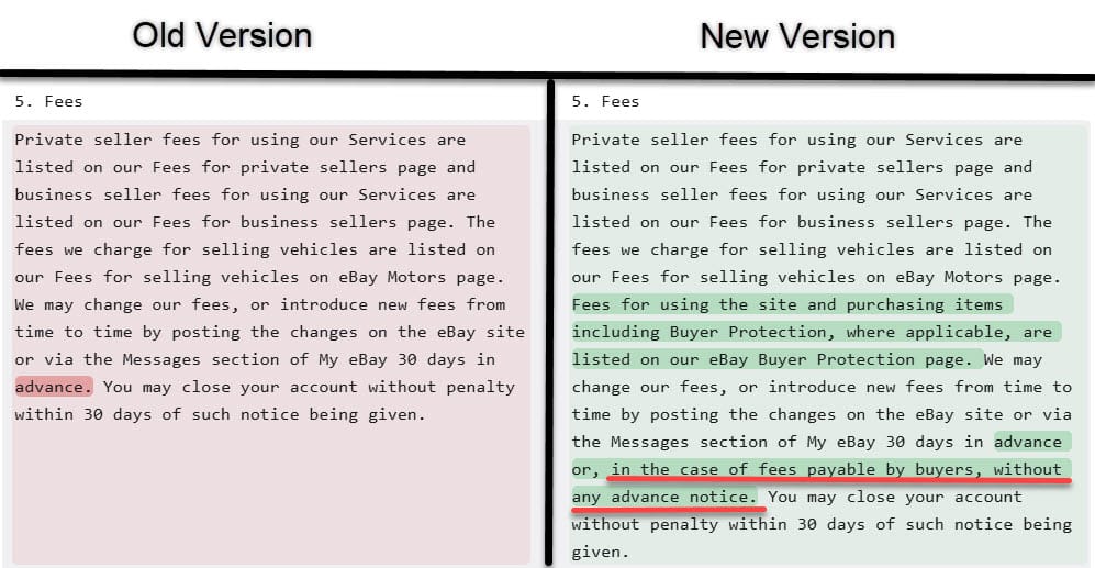 eBay has also updated their UK User Agreement to reflect terms about the new buyer fees, including this tidbit showing they can change at any time without needing to give the standard 30 day notice they must provide for seller fees.