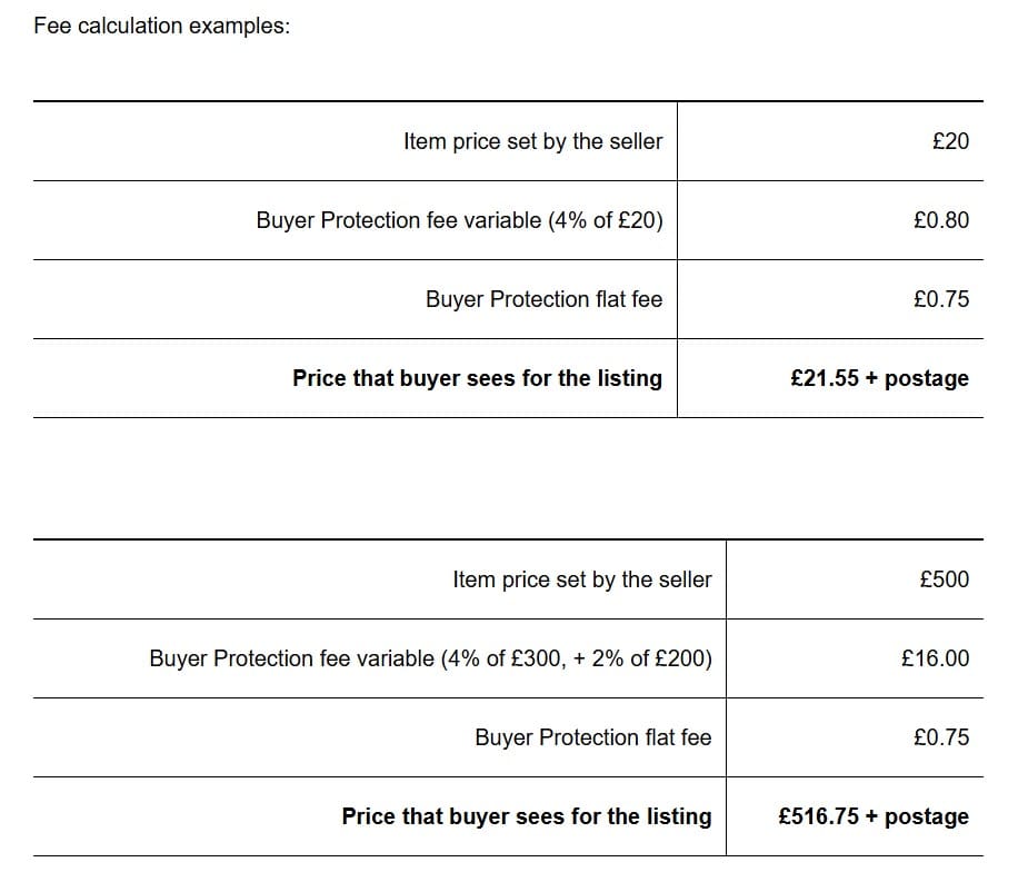 When setting the item price, UK-based private sellers will see the Buyer Protection fee amount added to the total item price that buyers will see on the listing. Sellers will be able to see the fee amount before completing the listing.