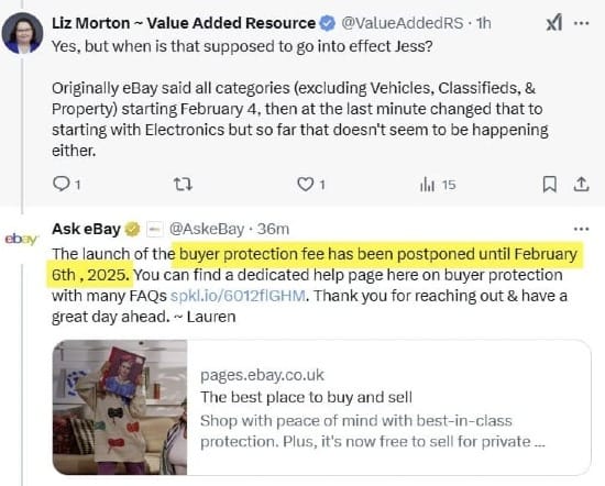 eBay's official support channel @AskeBay has confirmed launch of the Buyer Protection Fee has been pushed back until February 6th.