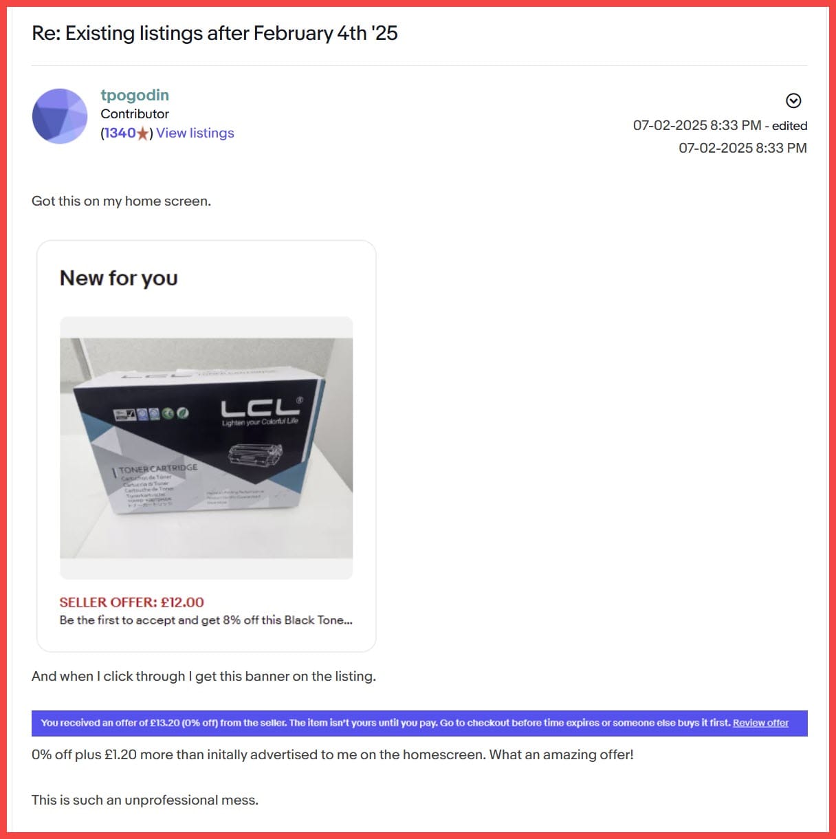 For example, one user said they received an offer at £12 (8% off) and clicked through to find a banner saying "You received an offer of £13.20 (0% off) from the seller."