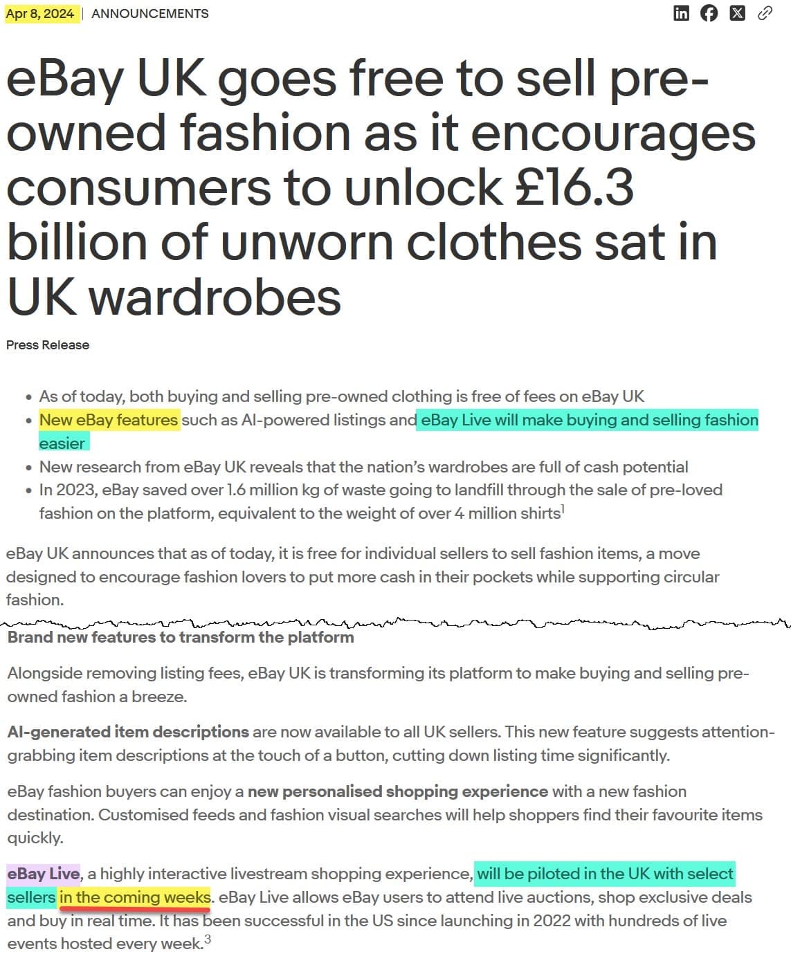 A different press release dated April 8, 2024 said they were piloting eBay Live with select UK sellers at that time as part of the initial rollout of fee-free selling for private accounts.