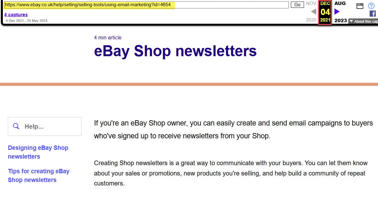 And the Internet Archive shows the help page for eBay UK Shop Newsletters has existed since at least December 2021.