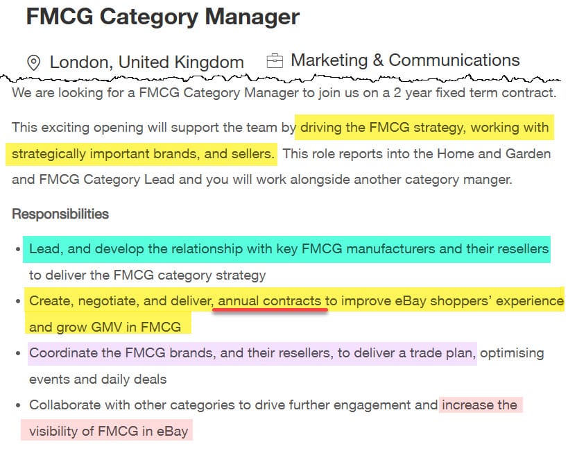 "Maintaining strong relationships with suppliers to secure the best deals on bulk goods" - that sure sounds like what eBay is aiming for in hiring an FMCG category manager and I wouldn't be at all surprised if the eventual goal is to try to leverage relationships with big brands and their resellers to bolster a paid membership or "subscribe and save" type offering built around deals on high demand, replenishable consumer goods.