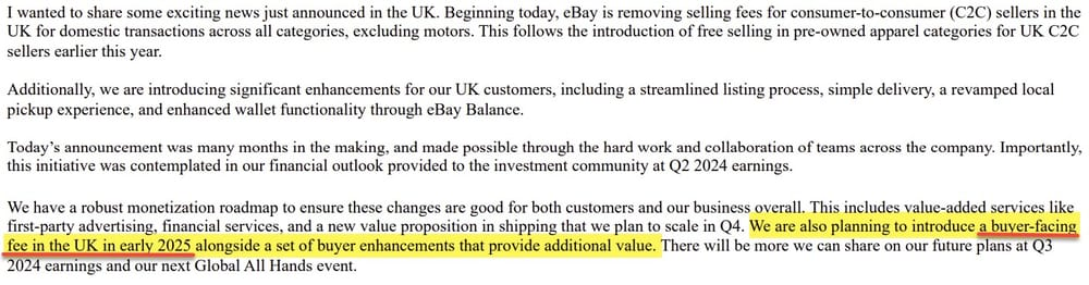eBay's eventual goal is to remonetize those sales by shifting the fee burden to the buyer side of the equation, with buyer fees set to be introduced sometime in the back half of Q1 2025.
