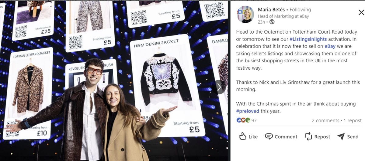 eBay UK is putting fee-free private selling front and center for the holidays with an immersive display in the heart of London that lets people shop pre-loved items across luxury, fashion, home, tech, and toys, from sellers across the UK.