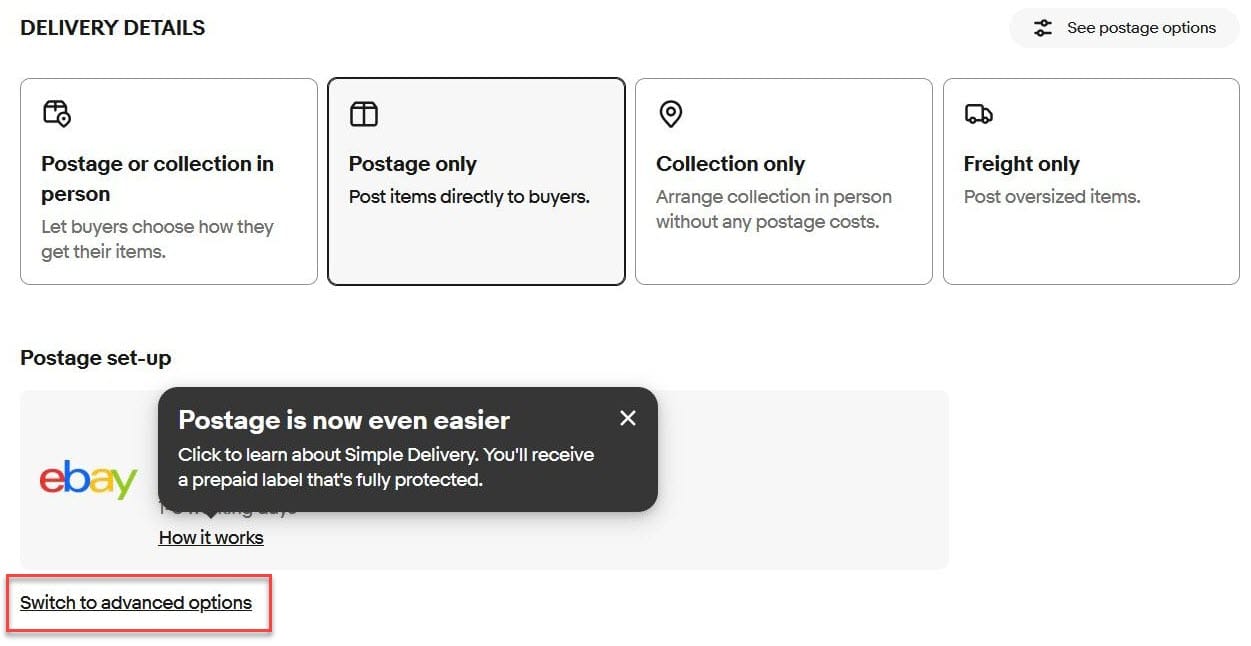While that option does appear to work for now, these workarounds will likely be short lived since eBay has made it very clear the eventual goal is to mandate Simple Delivery usage for all eligible items sold by private sellers in the UK.