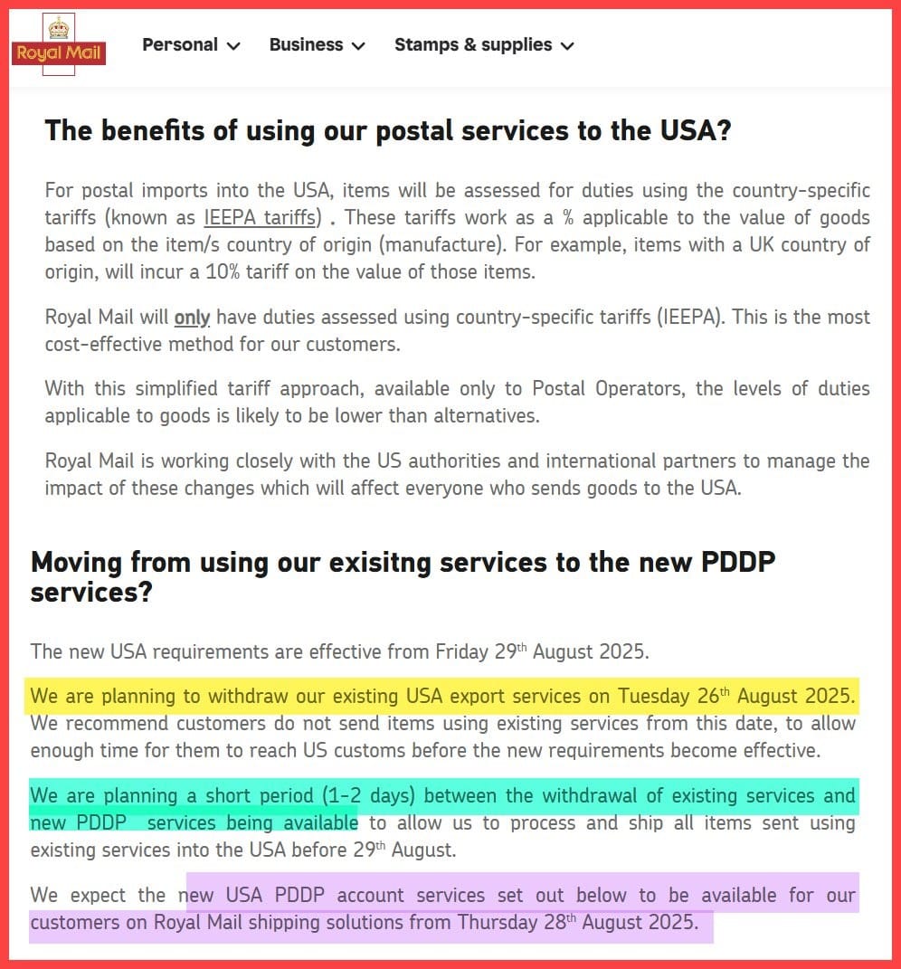 Royal Mail in the UK has advised shippers they are "working closely with the US authorities and international partners to manage the impact of these changes" and will be introducing a PDDP (Postal Delivered Duties Paid) service for account customers to use when exporting to the USA.