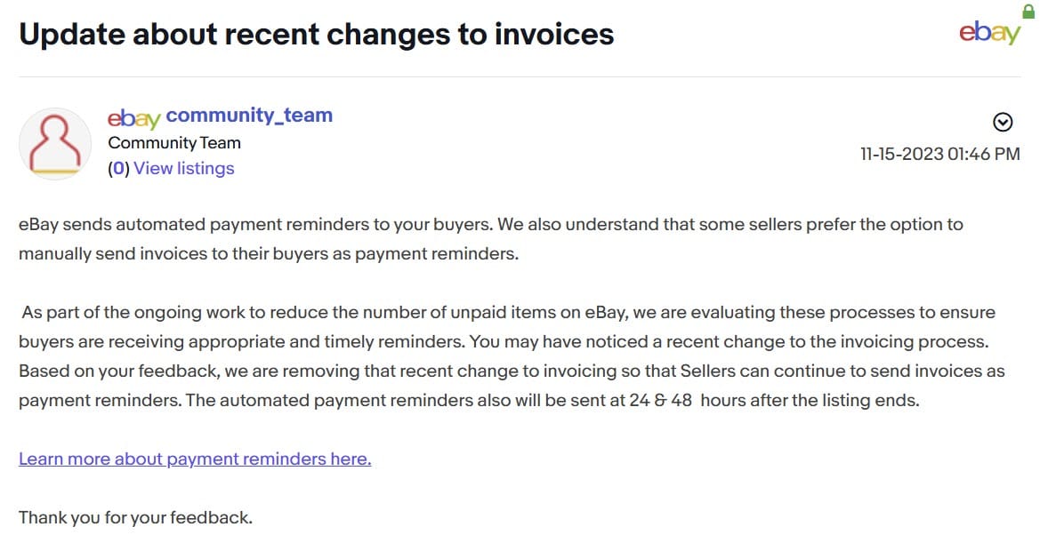 eBay eventually reversed course in the US after massive seller pushback and reinstated the invoicing option.