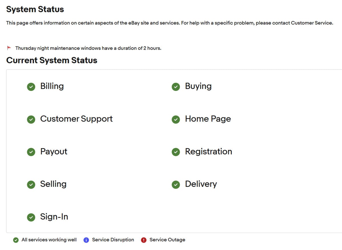 Meanwhile, the system status page for eBay.co.uk shows all green with no disruptions or outages, including for payouts - which is unsurprising since eBay has a long history of not keeping this page up to date, making it completely useless and forcing sellers to flood eBay's support channels when issues occur since they cannot trust they will get accurate or up to date information from this page.