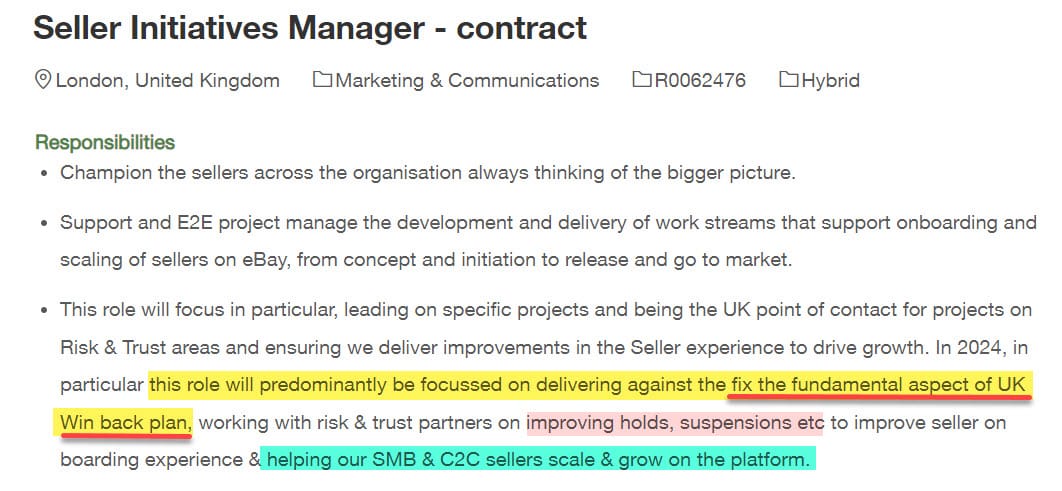 The job description says this role will specifically be helping to address trust and risk issues like holds on funds and account suspensions, then goes on to give a very interesting name for this new seller focused initiative - calling it the "fix the fundamental aspect of UK Win back plan."