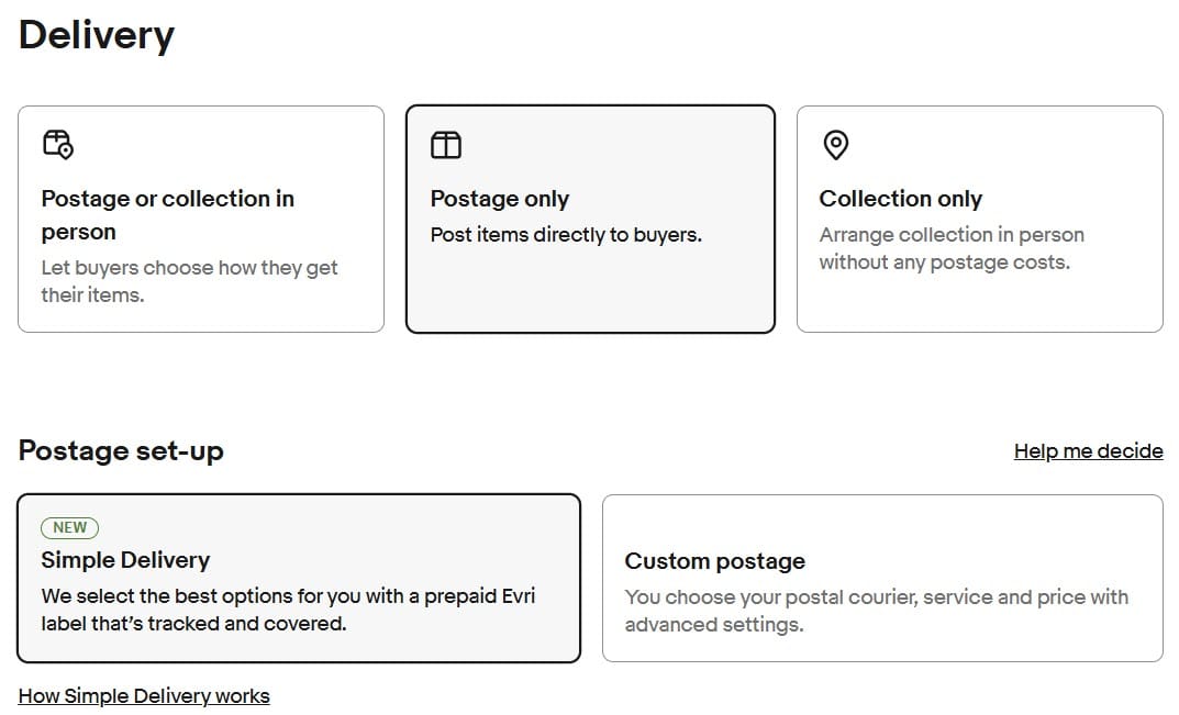 To customise your carrier preferences, head over to your postage preferences. Under the Simple Delivery settings, you’ll find a toggle next to each carrier. You can choose which carriers to include or exclude based on your needs.Please note that excluding carriers might lead to increased delivery costs and could limit the number of potential buyers for your items. If you require a collection from your address for all your items, consider selecting Royal Mail only, as they provide collection for Simple Delivery items.