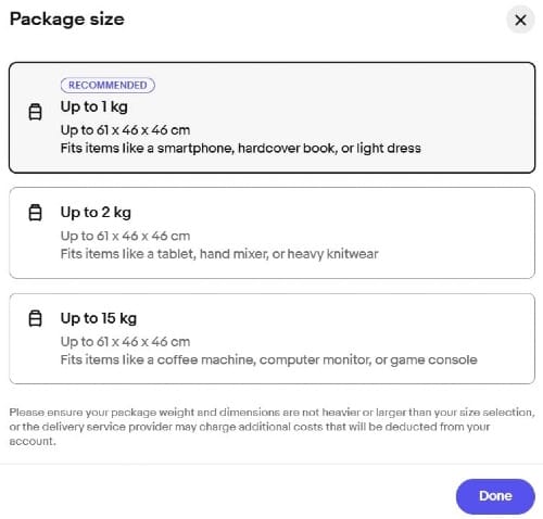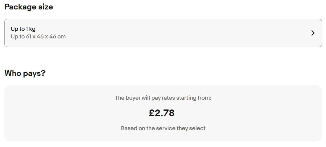 If Simple Delivery is selected, eBay will select a default weight and size selection and show an estimated "starting from" rate that will be shown to the buyer