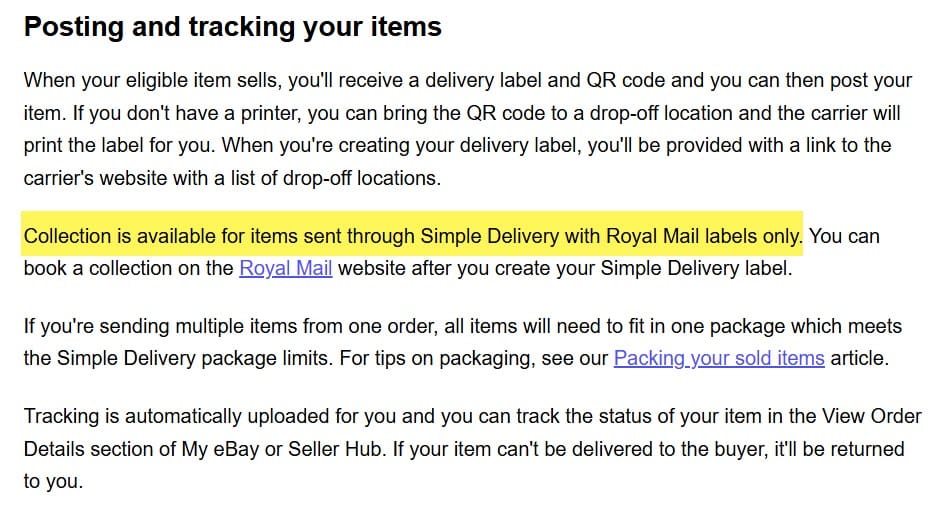 Since it is only available for labels which use Royal Mail though, that could still pose accessibility issues - unless eBay really does intend to allow sellers to control which carriers they will or will not use for Simple Delivery.
