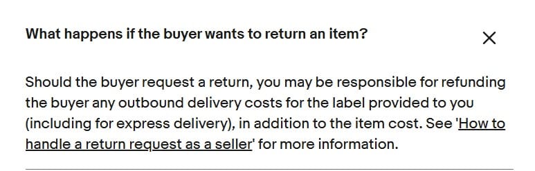 Should the buyer request a return, you may be responsible for refunding the buyer any outbound delivery costs for the label provided to you (including for express delivery), in addition to the item cost.