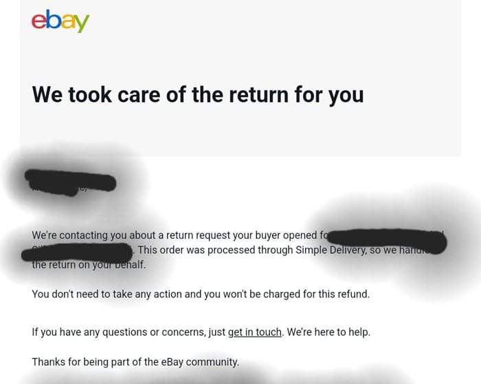The message they received from eBay clearly shows why: "This order was processed through Simple Delivery, so we handle the return on your behalf. You don't need to take any action and you won't be charged for this refund."