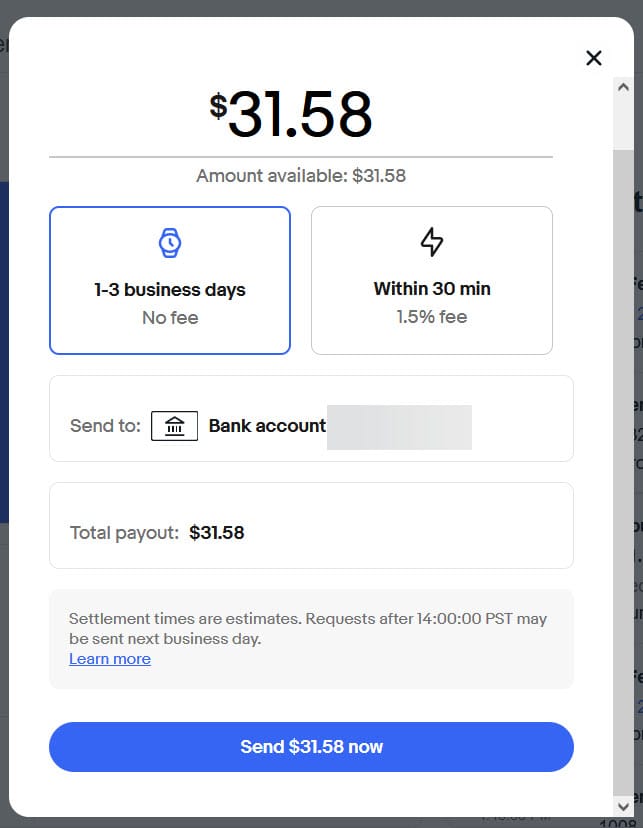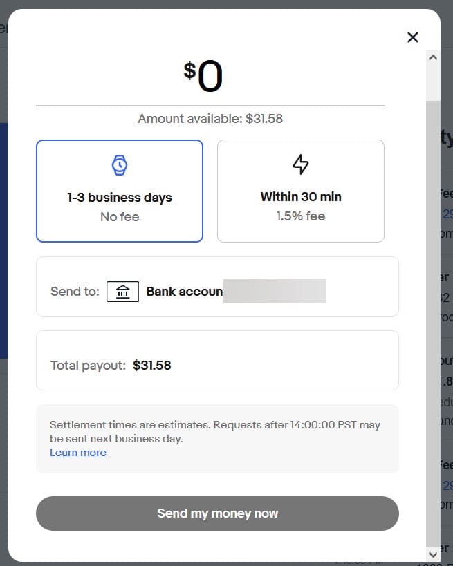 The seller could edit the number if they did not want to request the full amount for any reason, but in most cases they simply clicked the blue "send my money now button" to initiate either a free payout to their bank account or an Express payout for a free to their debit card.