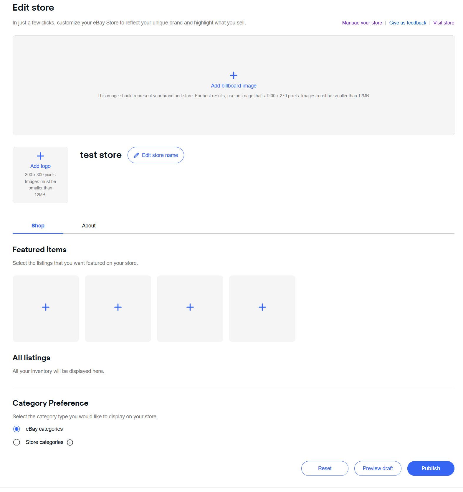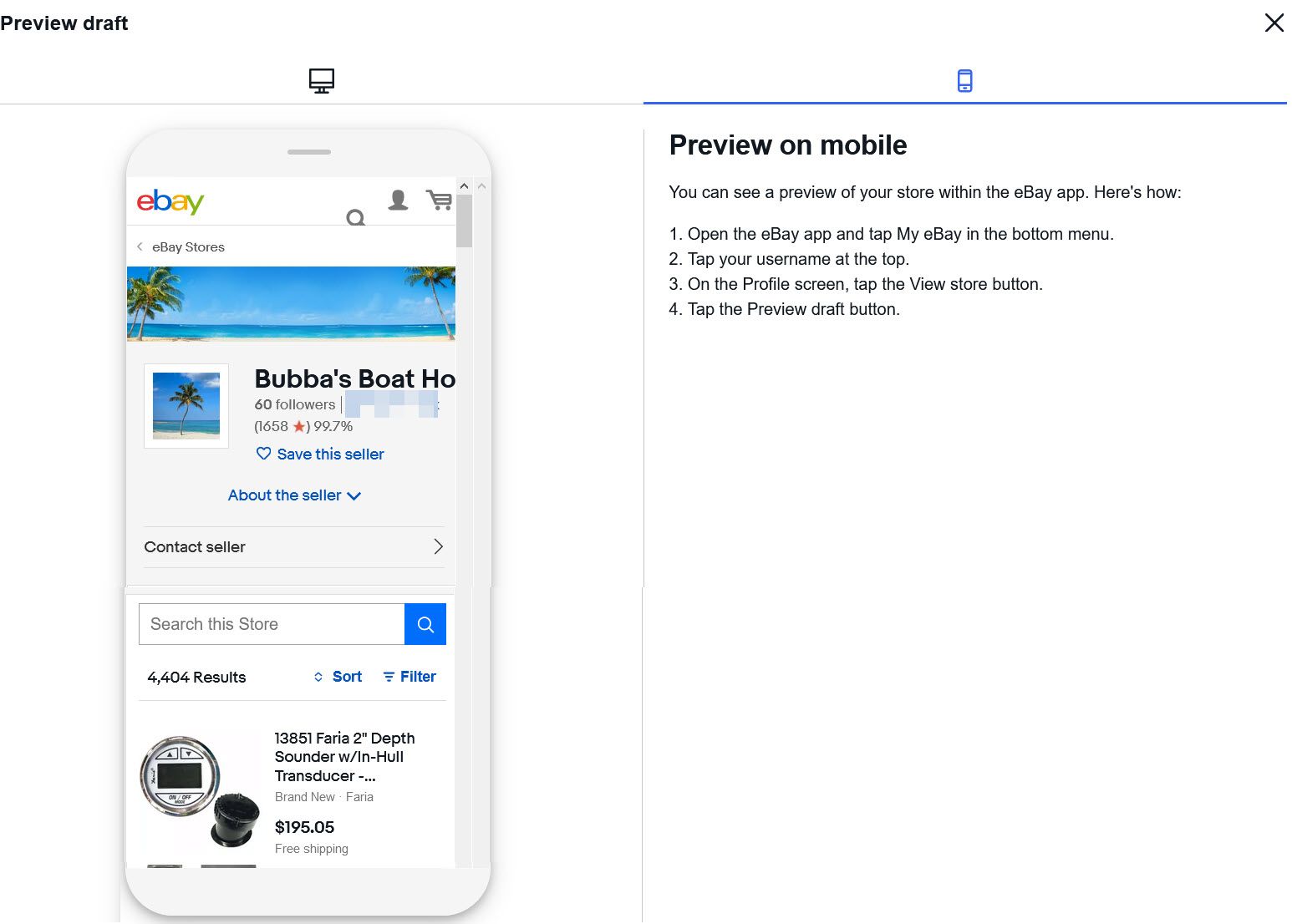 Once you choose a banner and logo image and fill in the About section, you can preview a draft of the store in either desktop or mobile view.