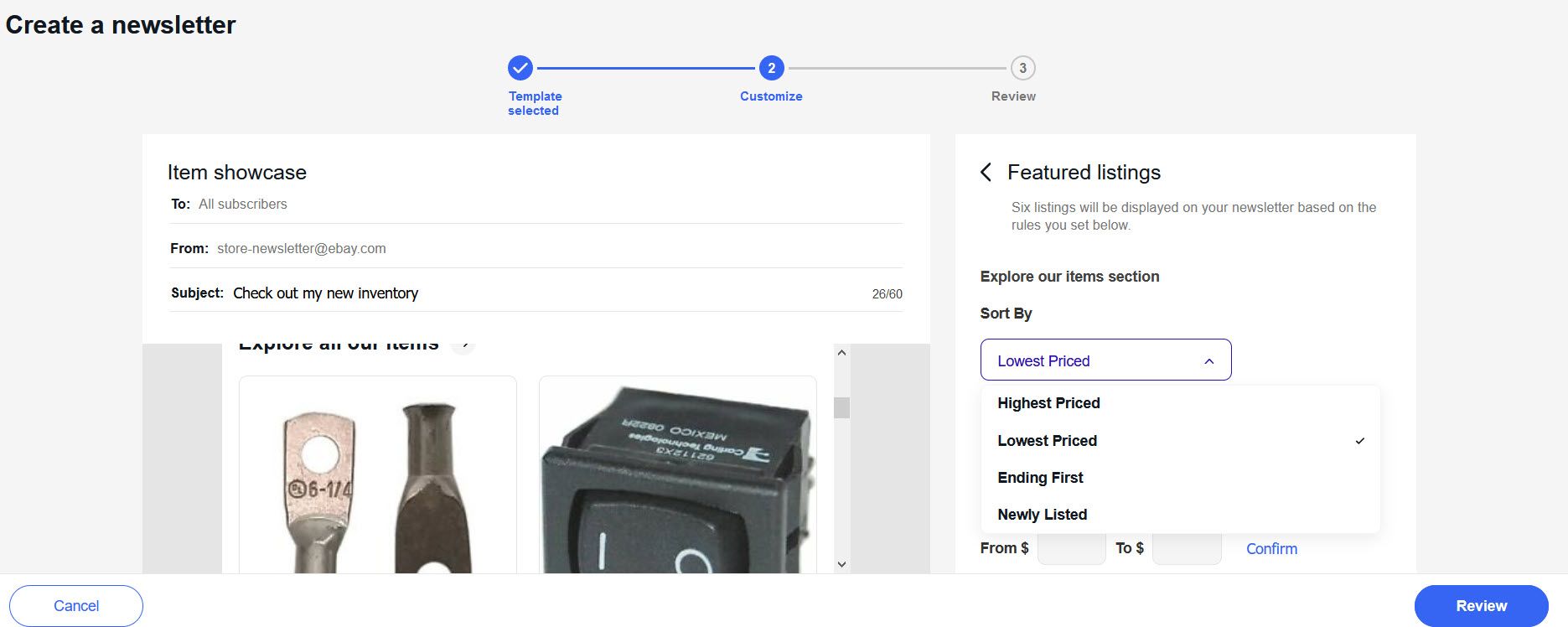 The Item Showcase email allows you to enter a personalized message and choose which items to feature.