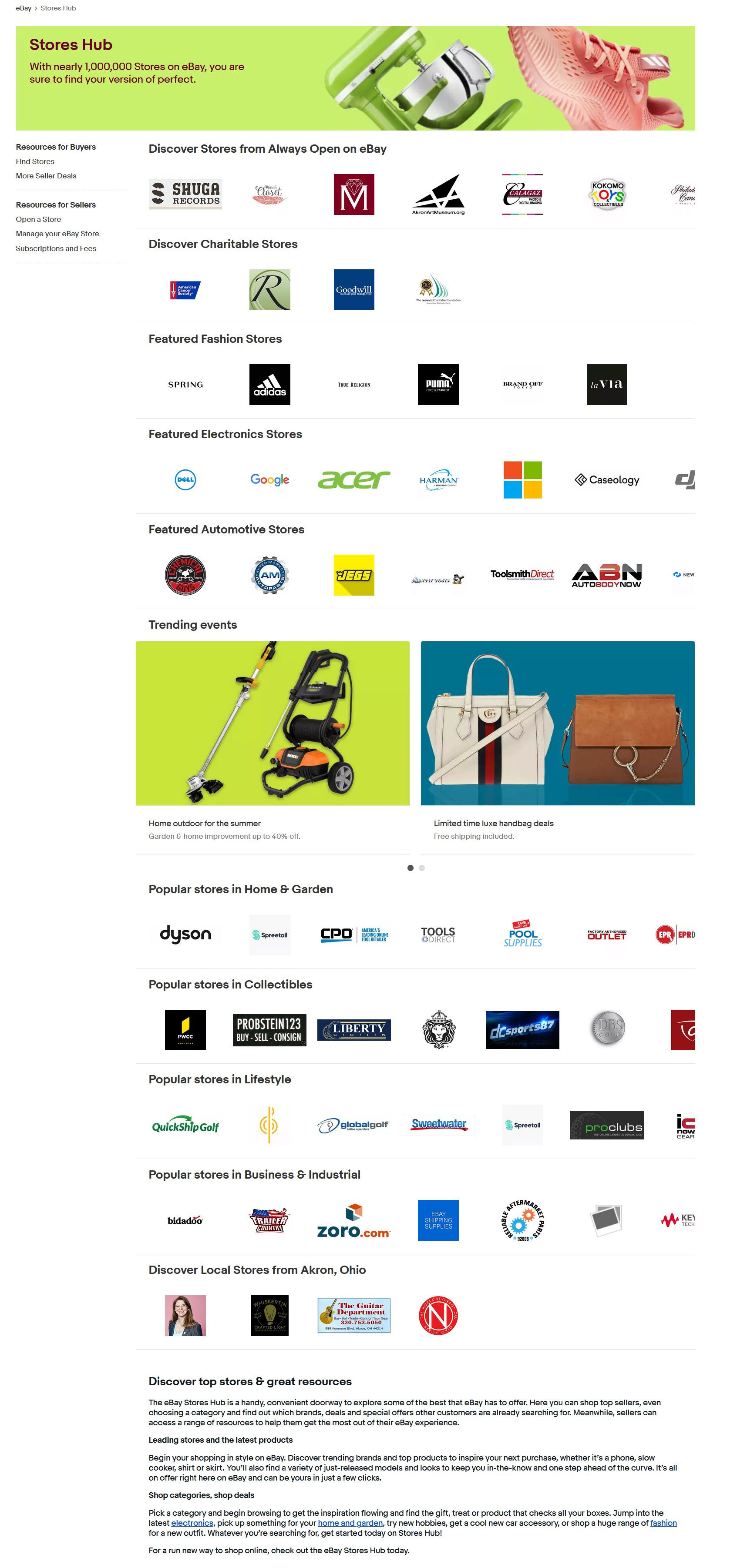 eBay also has a Stores Hub page, which features stores across multiples categories.