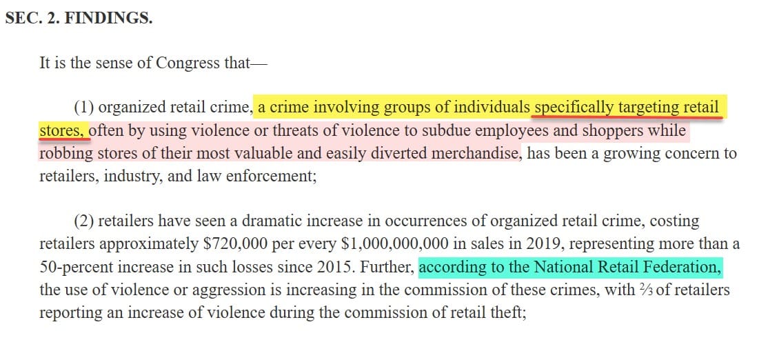 For example, SEC. 2. Findings explicitly refers to ORC as a crime involving "groups of individuals specifically targeting retail stores" and cites NRF reports on the use of violence in physical brick and mortar retail theft.