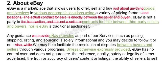 The first section of changes doesn't have anything particularly important, but it's clear the lawyers have been here. I guess "just about anything" was too open ended and eBay apparently feels it needs to be extremely clear they are not a party to the transaction and do not take any responsibility or accountability for....anything.
