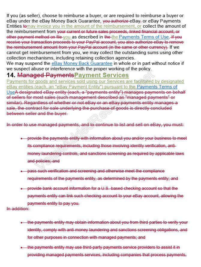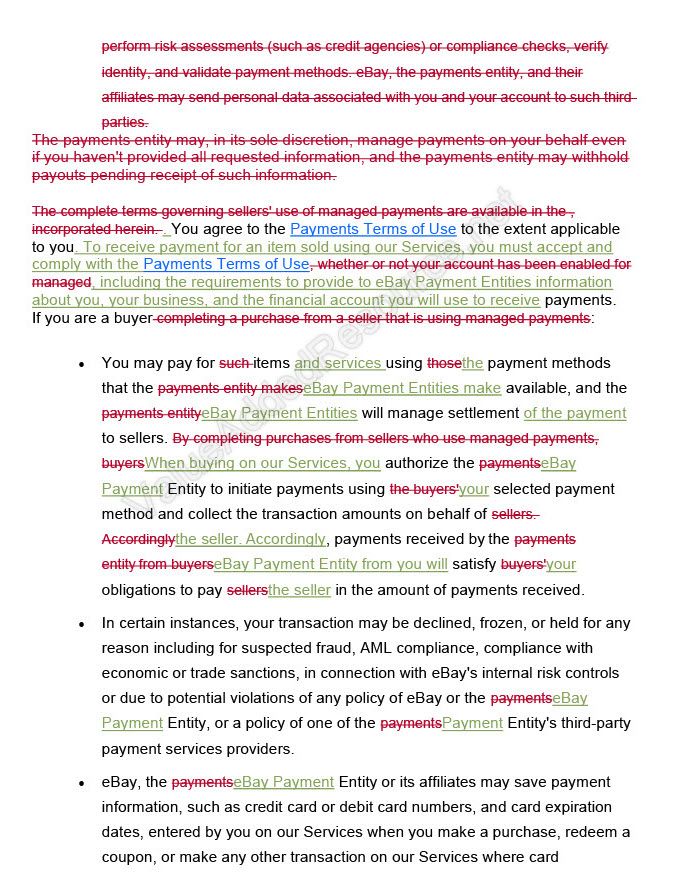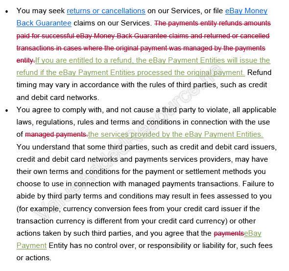Mostly housekeeping and cleaning up language in the next three sections as well - though it's interesting to note that eBay seems to be moving away from the term Managed Payments and toward eBay Payment Entities.