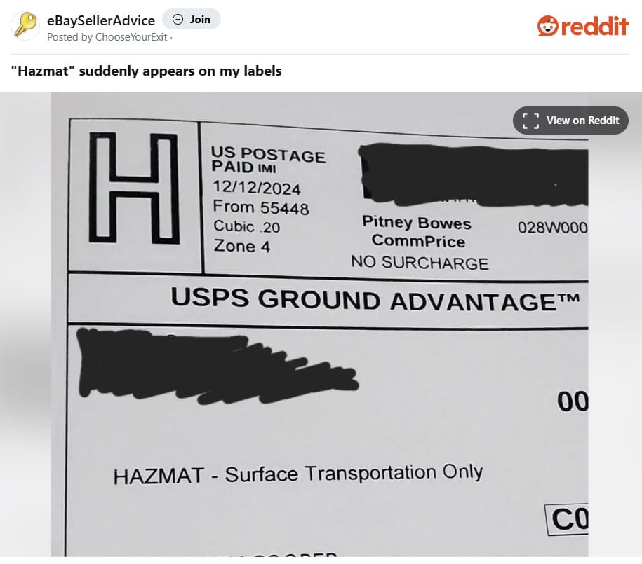 eBay sellers are in a panic this morning as all USPS Ground Advantage labels purchased through the platform appear to be being designated as Hazmat restricted even for non-hazardous items.