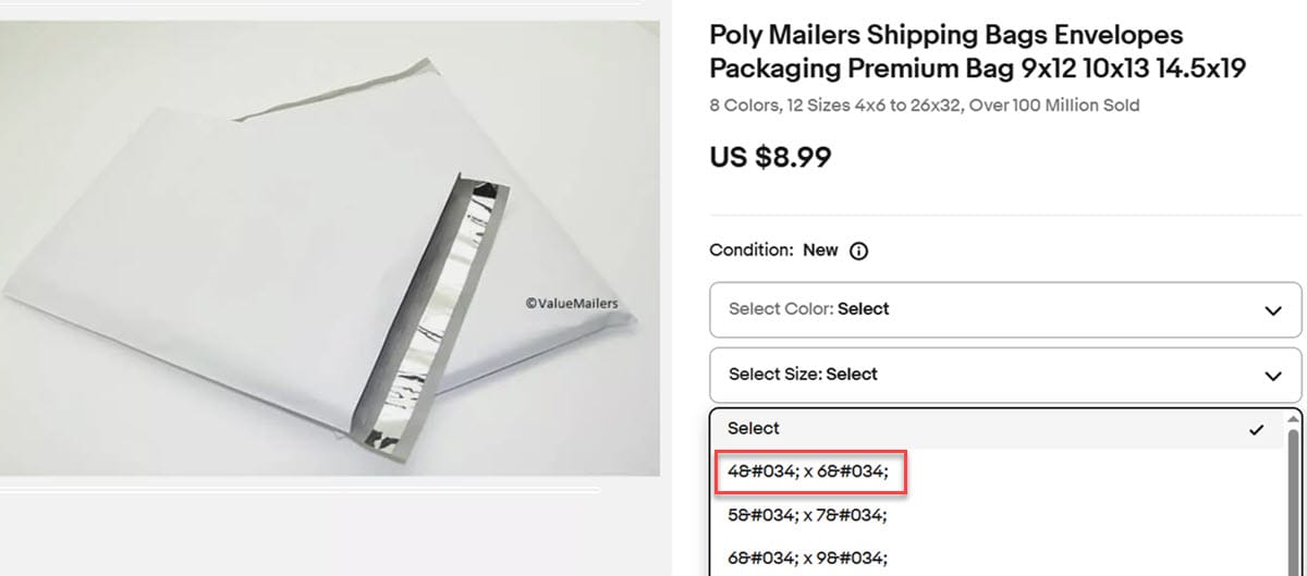 eBay sellers who use the variation listing option are experiencing an HTML error which adds odd characters to dropdown menus that may negatively impact sales.