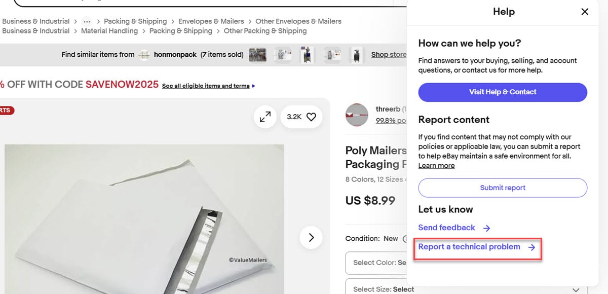 The technical issue is being discussed in the eBay community forum, showing coding problems with options that use apostrophes, quotation marks or ampersands.
