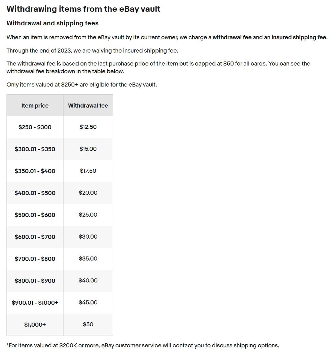 When an item in the eBay vault is sold and the buyer ships it directly to their address, we charge the buyer both the vault buyer's premium and the withdrawal fee, as well as an insured shipping fee.When an item in the eBay vault is sold and the buyer keeps it there, we'll only charge the vault buyer's premium at the time of the transaction.
