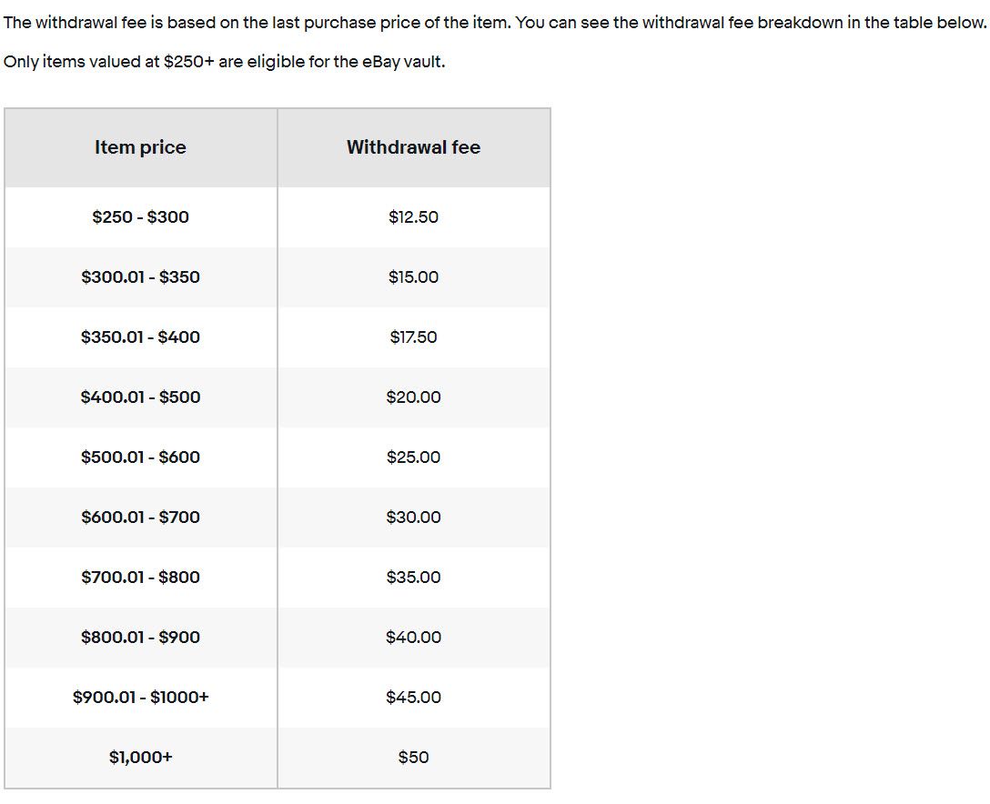 Currently eBay has waived most selling, storage, and buying fees for items in the Vault in order to encourage adoption but one fee they have not waived is the withdrawal fee.