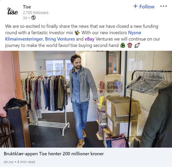 Since then, I've been keeping an eye out to see what kind of businesses eBay has in mind for this nascent initiative and it looks like we finally have a winner - Norwegian second-hand clothing and furniture marketplace Tise.