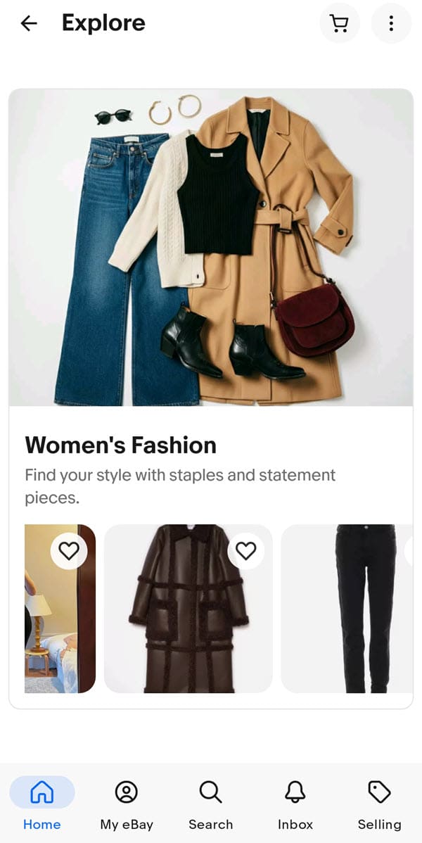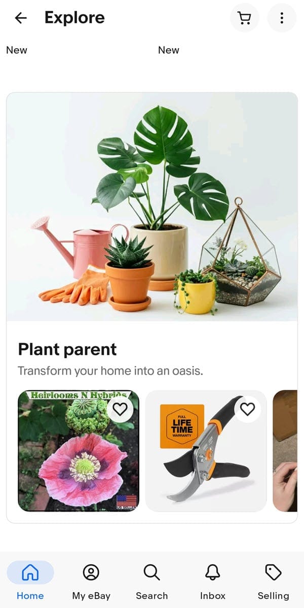 As you scroll down, eBay also now inserts random suggested categories/items like Plant Parent or Women's Fashion.