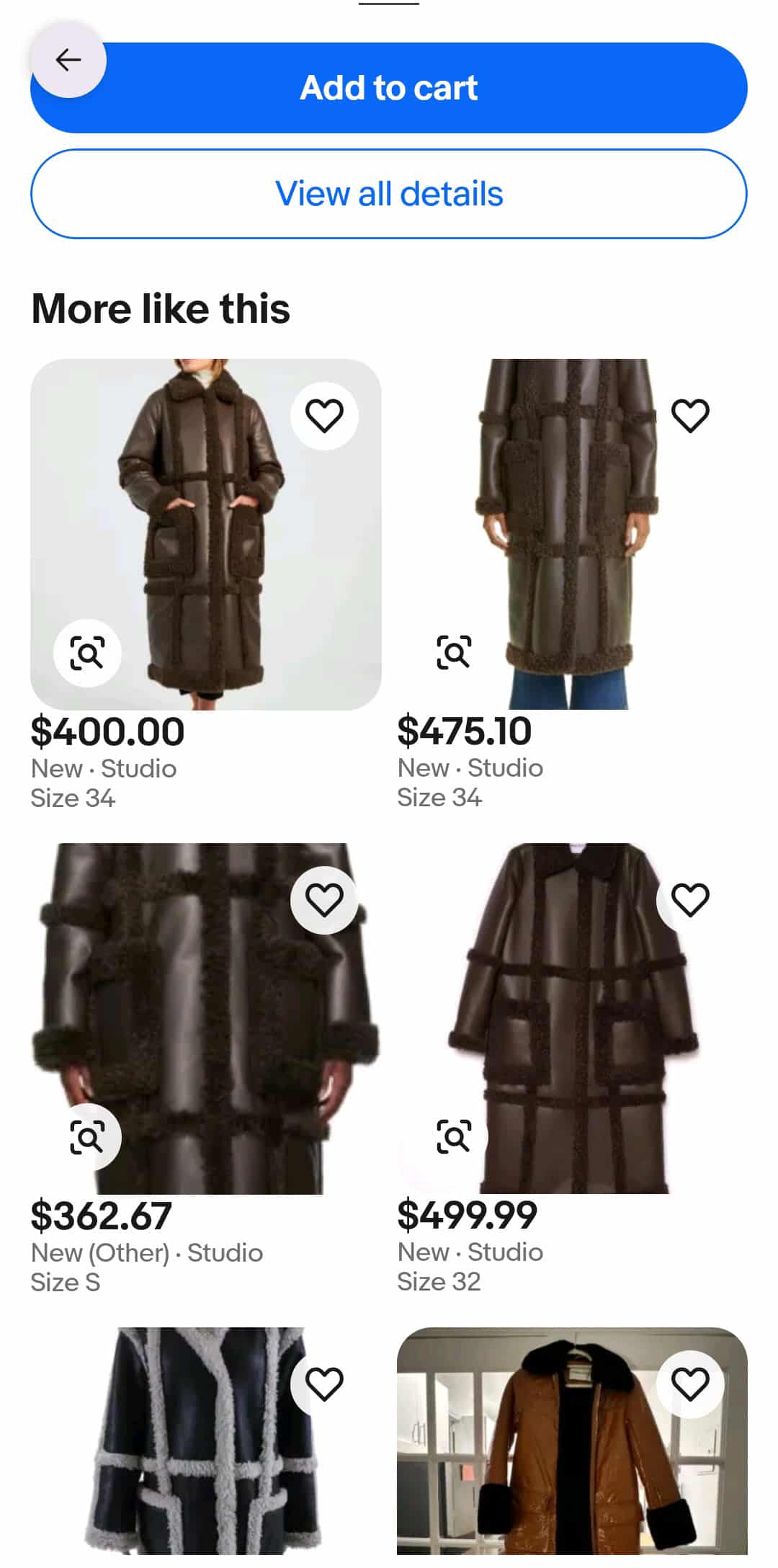 After selecting an item from the Explore view, eBay overlays an icon on the image to perform an additional visually similar search and scrolling past the add to cart or view all details buttons provides a list of additional similar items, each with their own option to launch a new visual search based on that image.