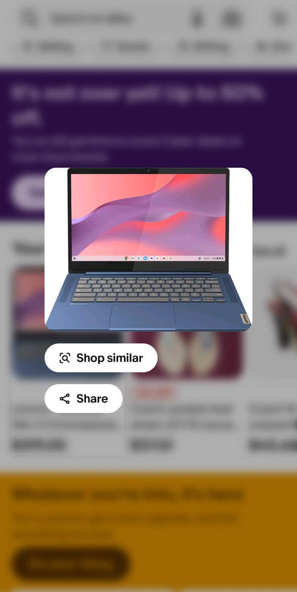 Pressing and holding the thumbnail image then opens a pop up with options to share or shop similar, which when selected takes the user to a results page of visually similar items.