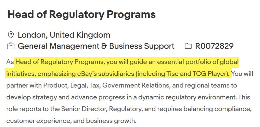 eBay is also seeking a Head of Regulatory Programs based in the UK to manage global regulatory issues - including for subsidiaries like TCGPlayer and Tise.