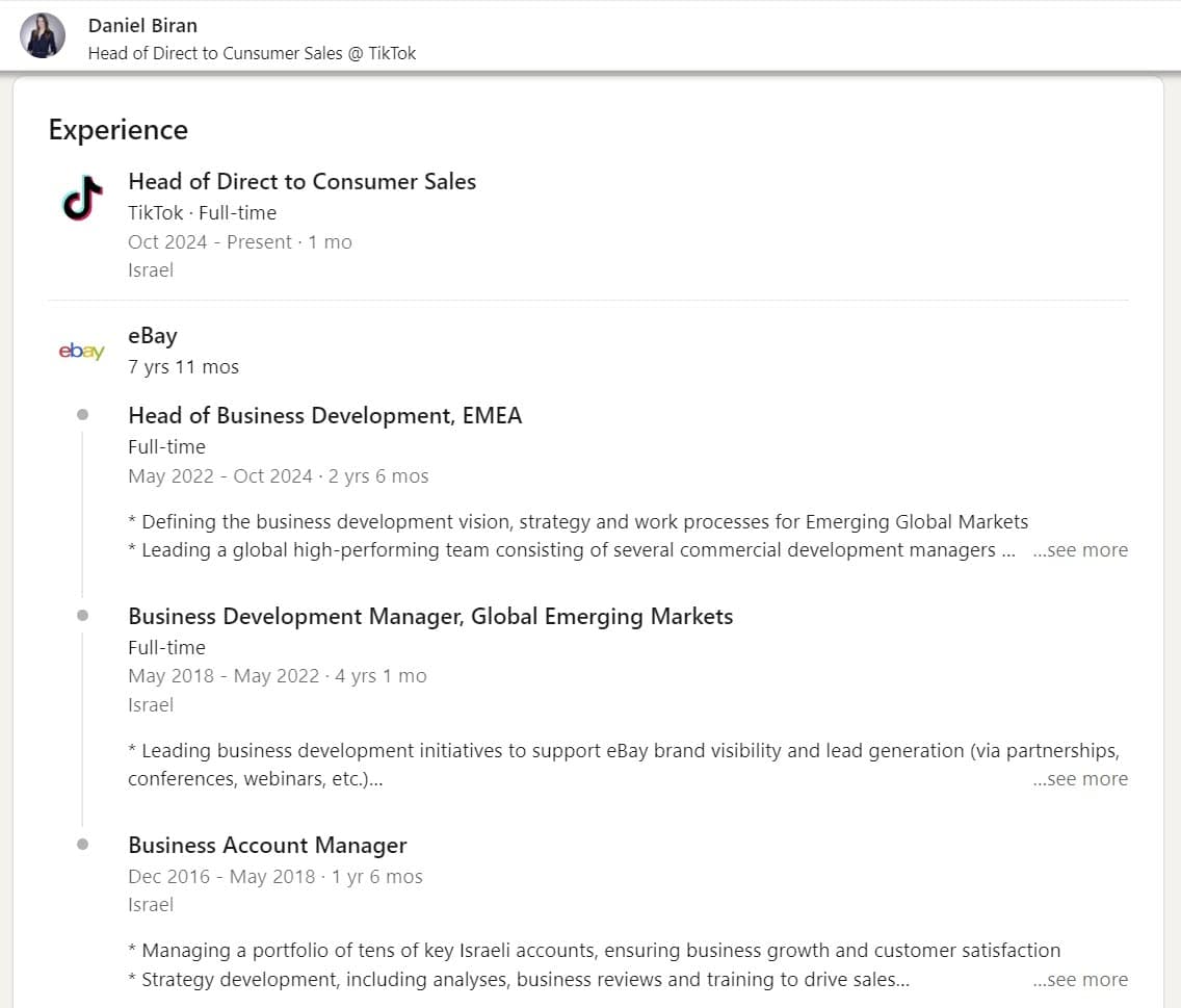 Head of Business Development Europe, Middle East, and Africa, Daniel Biran, departed eBay this month after almost 8 years at the company to take on Head of Direct to Consumer Sales role at TikTok.