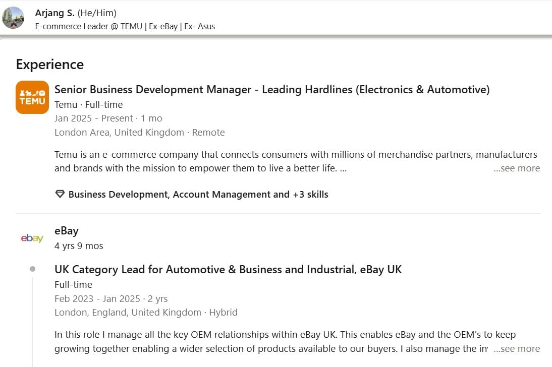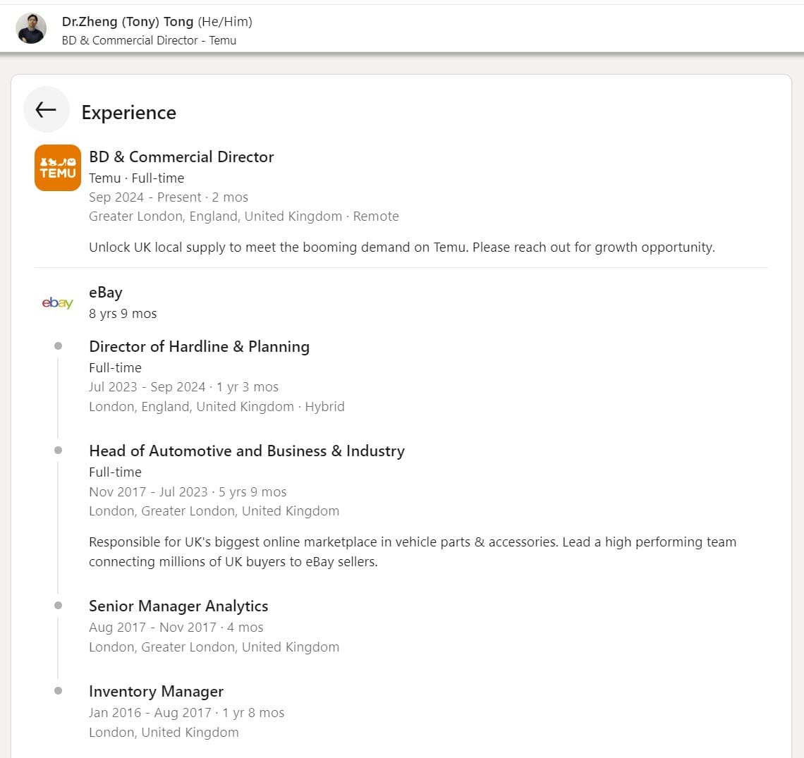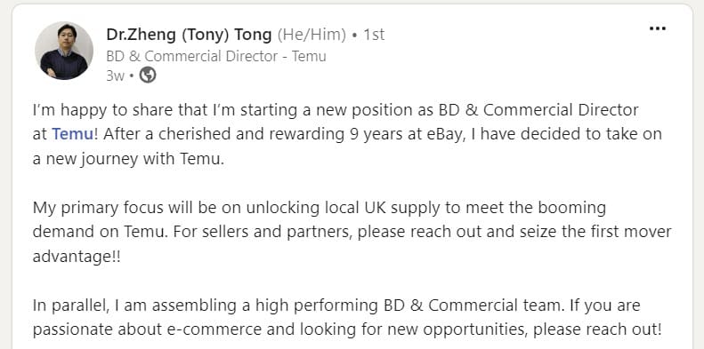 More eBay business development and strategy leaders have jumped ship to Temu with eBay UK Category Lead for Automotive & Business and Industrial, Arjang Salehi taking a Senior Business Development Manager position under Dr. Zheng (Tony) Tong.