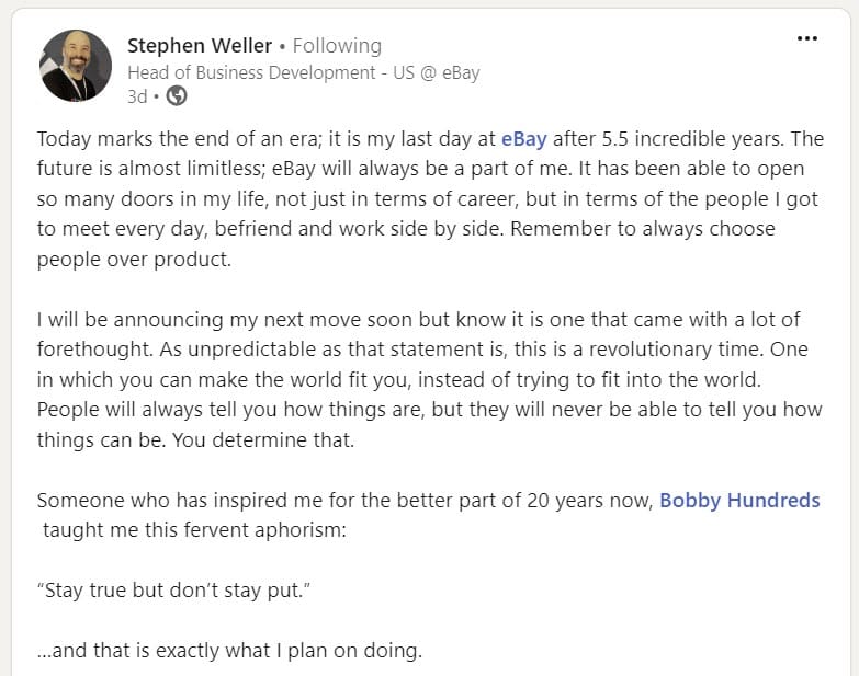And Head Of Business Development US Stephen Weller has also announced his departure after 5+ years at the eBay, though he has not yet revealed where he'll be landing next.