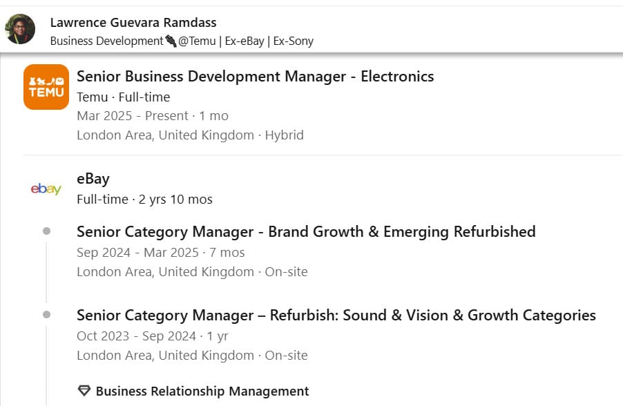 And UK Senior Category Manager - Brand Growth & Emerging Refurbished Lawrence Guevara Ramdass moving on to a Business Development Manager role in Electronics at Temu.