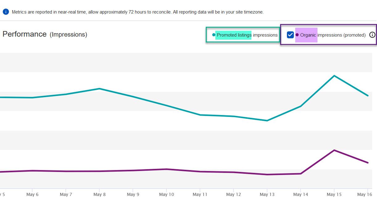 The Listing Traffic History report uses the turquoise/green color to represent Organic traffic and the purple/pink color to represent Promoted Listings traffic - but the Ad Dashboard report is exactly the opposite.