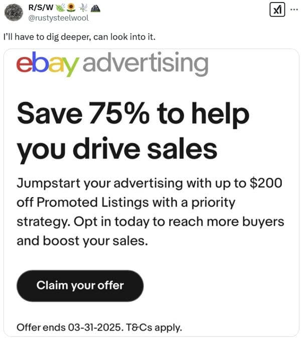 If eBay is feeling the need to pull out the stops, and discounts, to goose Promoted Listings General cost per sale ad adoption too, that could signal sellers' tolerance for increasing ad rates and expanding attribution models have hit a wall, particularly due to changes eBay made in Q4 2024.