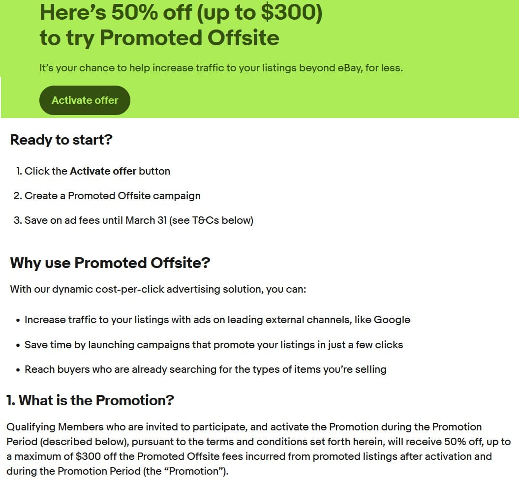 For example, some sellers have received an offer of 50% off Offsite cost per click ads, up to $300 through March 31st.