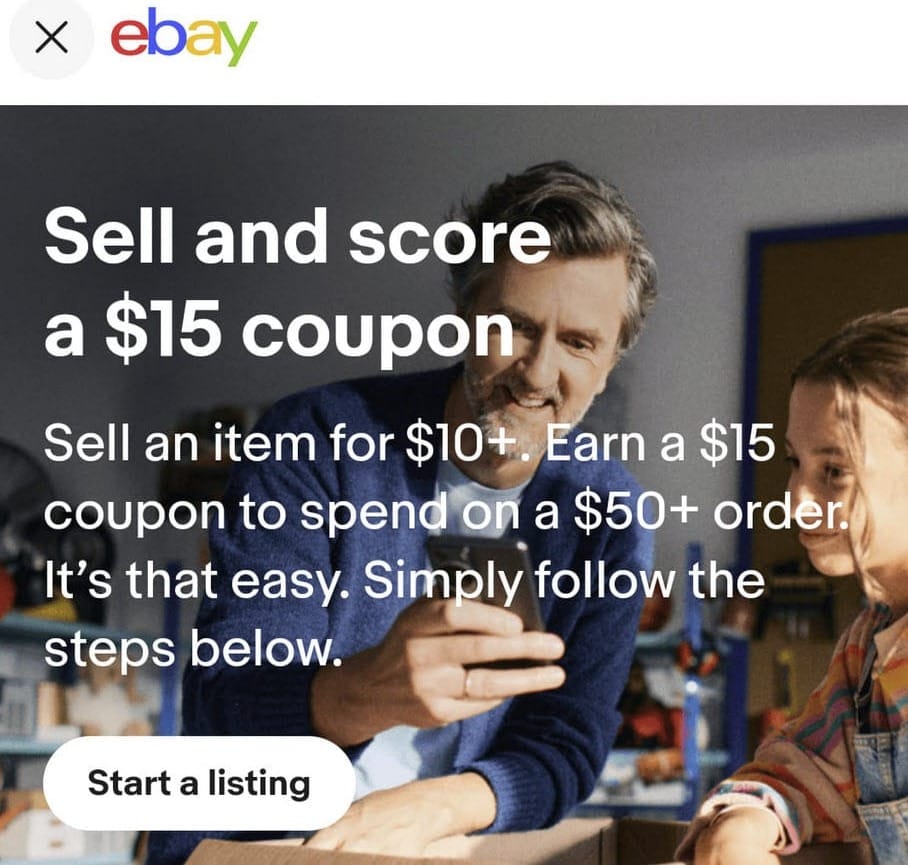 Now, eBay is taking it a step further, hoping to secure an increase in those critical "enthusiast buyers" by specifically incentivizing new sellers to become buyers too, offering a $15 coupon to spend on a purchase of $50 or more, if they sell an item for $10+.