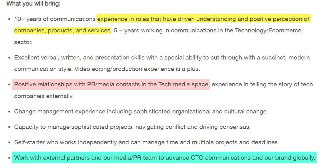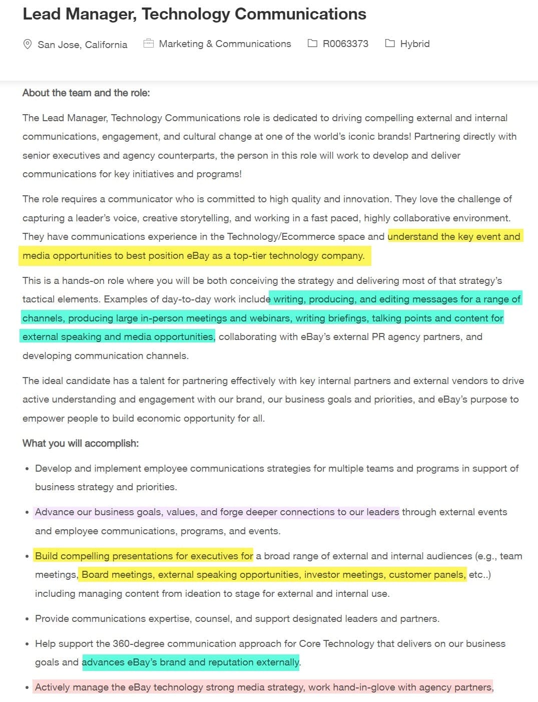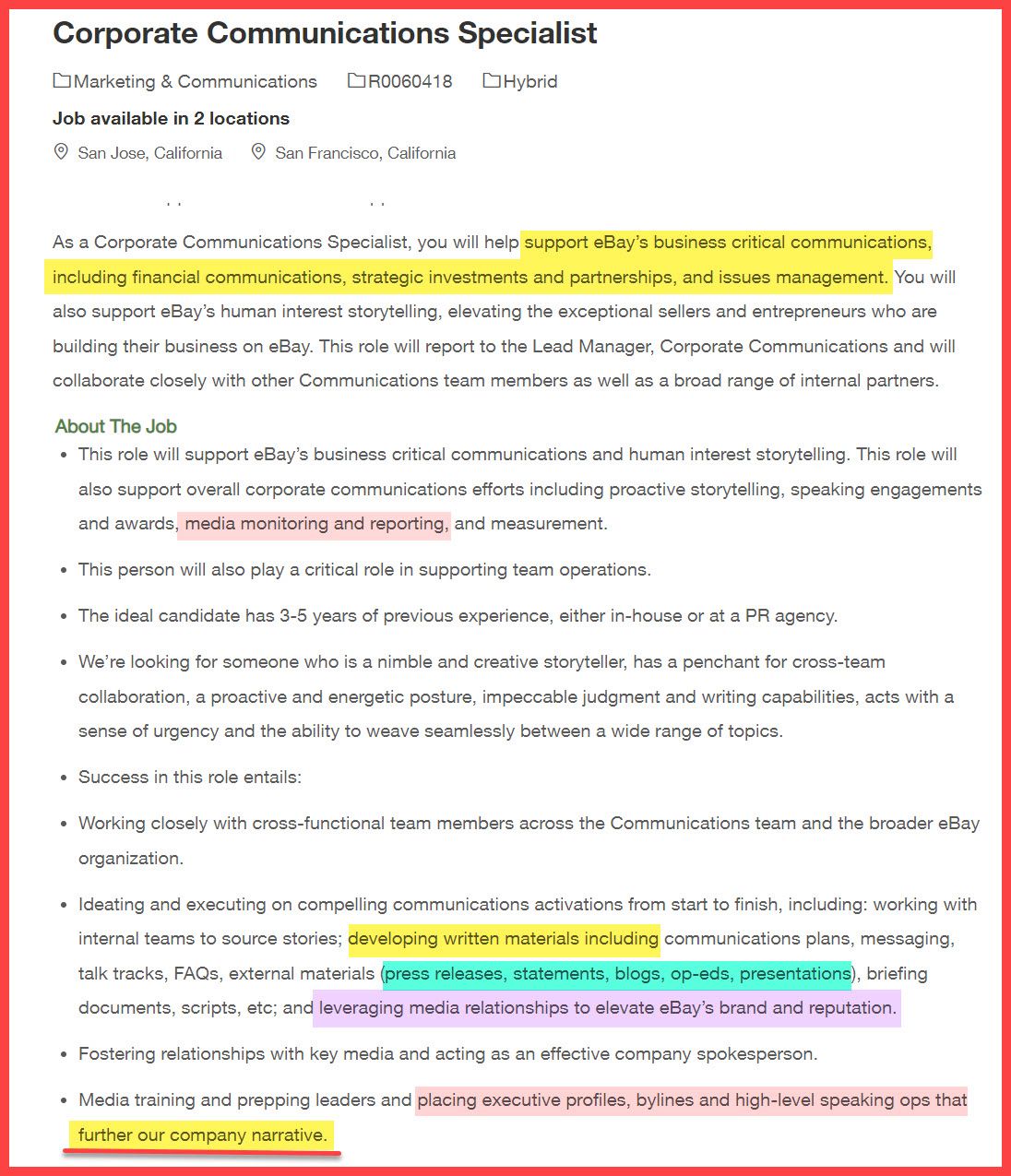 In fact, eBay is so concerned about their media strategy, they explicitly state applicants for this role must already have "positive relationships with PR/media contacts in the Tech media space" to bring with them to help drive positive perception of the company and advance CTO Communications and the eBay brand globally.