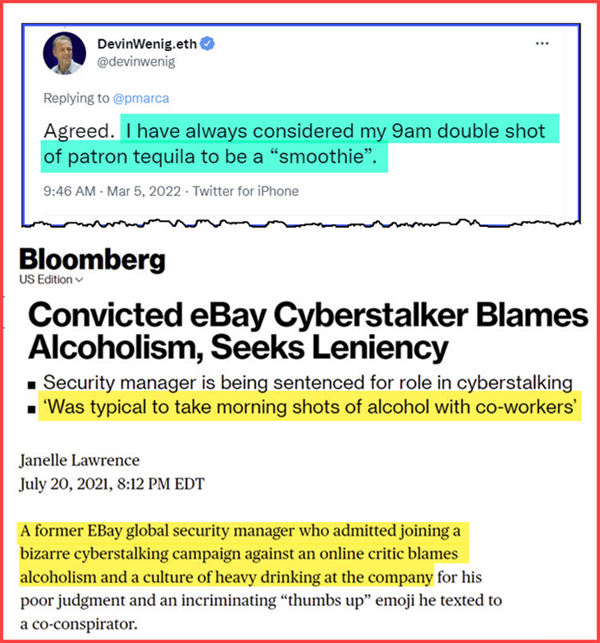 Ex-CEO Devin Wenig (who was not named in the criminal case, but is named in the civil case still awaiting settlement or trial) apparently has no remorse for the cultural tone he set during his tenure and can still be found joking about 9 AM tequila shot "smoothies" on Twitter.