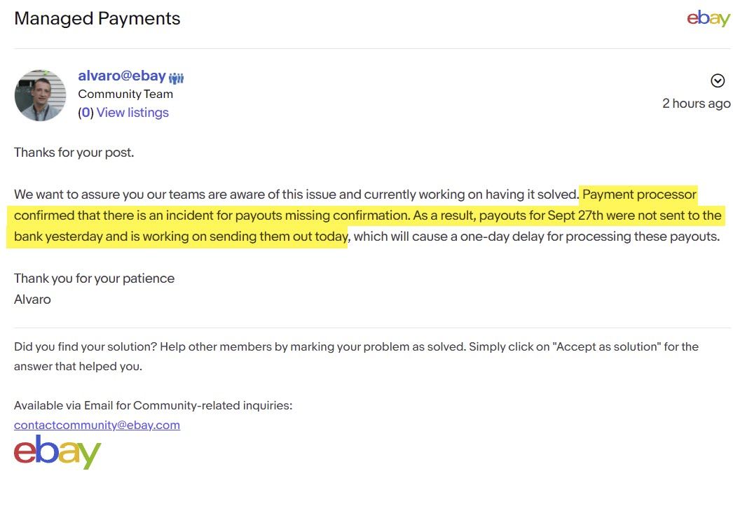 eBayUK sellers are reporting delays in Managed Payments payouts from September 28th, 2021.